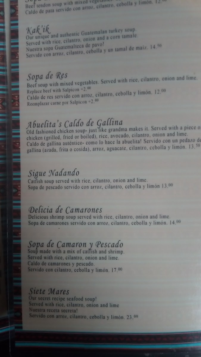 Our unique and authentic Guatemalan turkey soup. Served with rice, cilantro, onion, and corn tamale